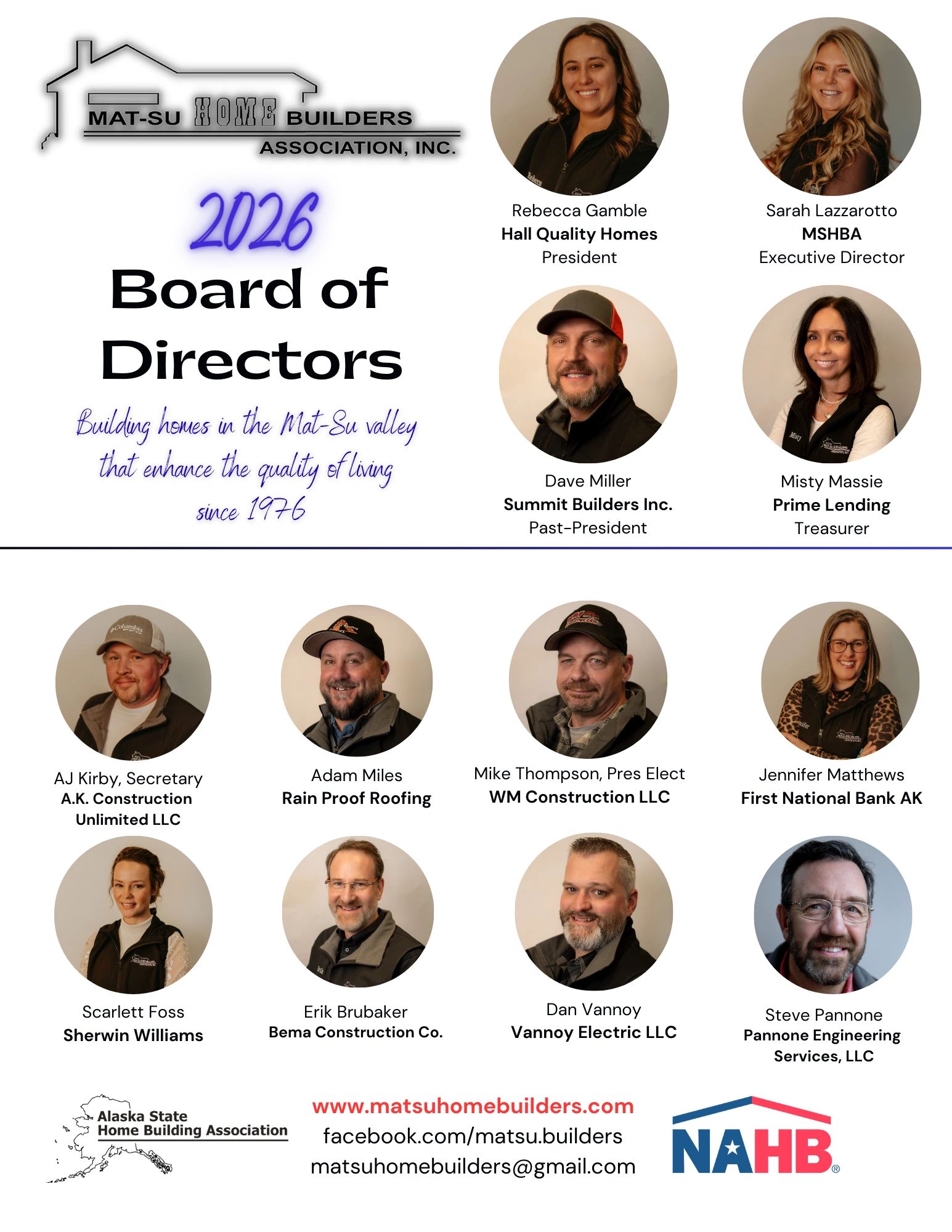 Sarah has served as the executive director for the Mat-Su Home Builders Association since November of 2013. With a background in banking, employee management and customer service, the MSHBA was a great place for Sarah to bring an exciting approach to our membership-based nonprofit. Her favorite part of the job is connecting with members at networking events and coordinating charitable efforts for the community and local students. In her free time, Sarah enjoys exploring our beautiful state with her husband and son, reading, gardening and supporting small business by shopping local.